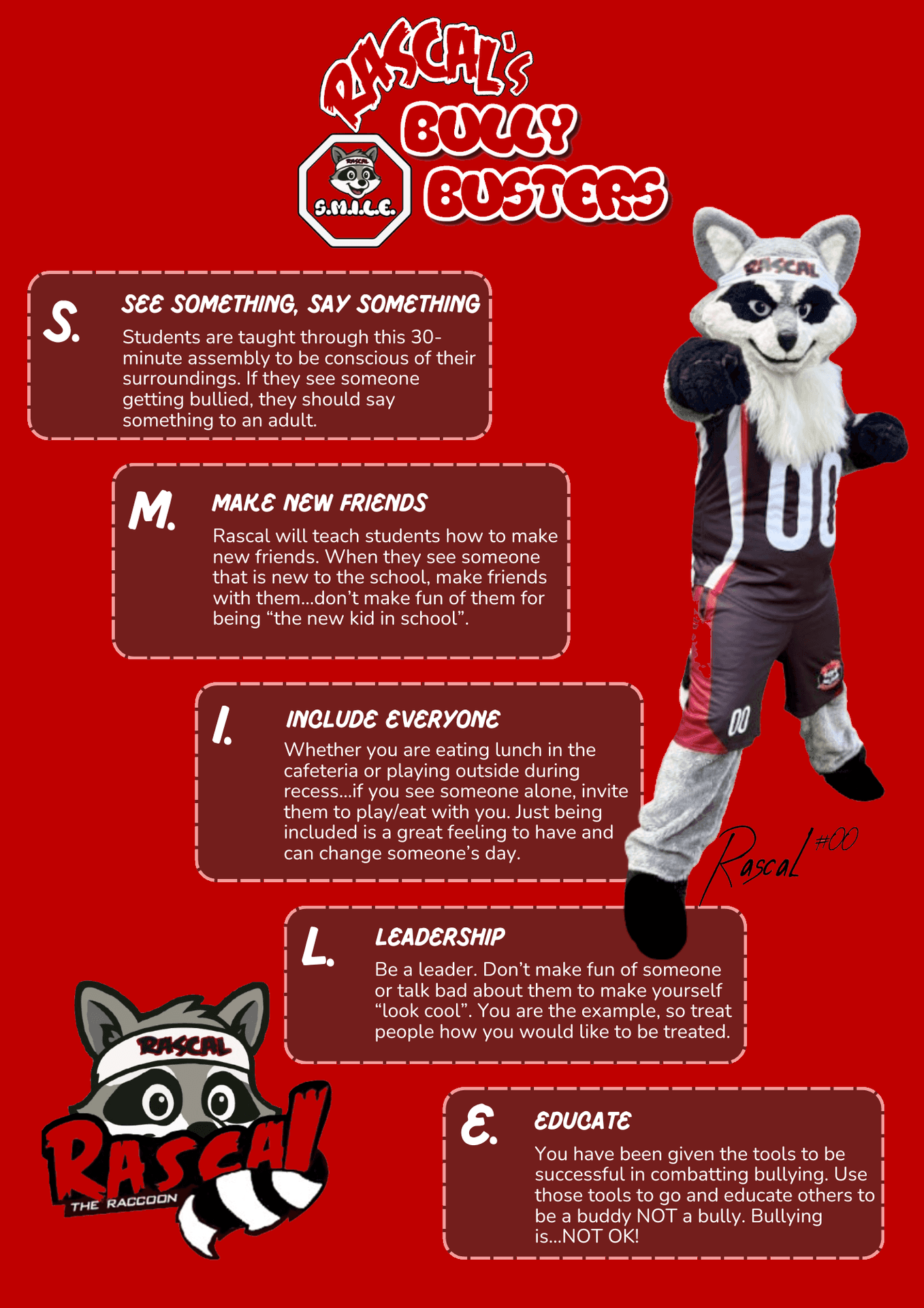 Rascal and his emcee will teach S.M.I.L.E. to all the children through physical comedy, as well as talking about real life situations. They will also go over the different types of bullying and what they mean (physical bullying, mental bullying, self-bullying, and online bullying).